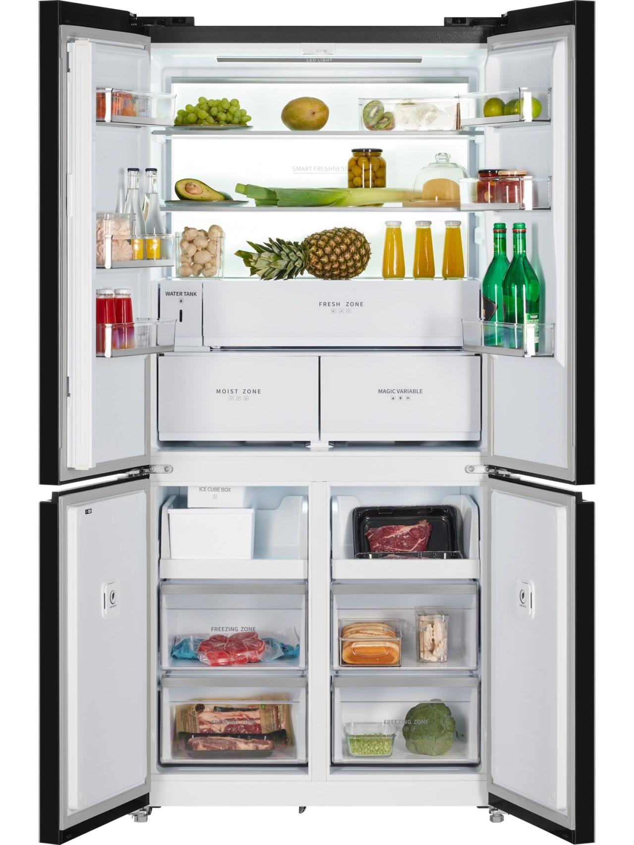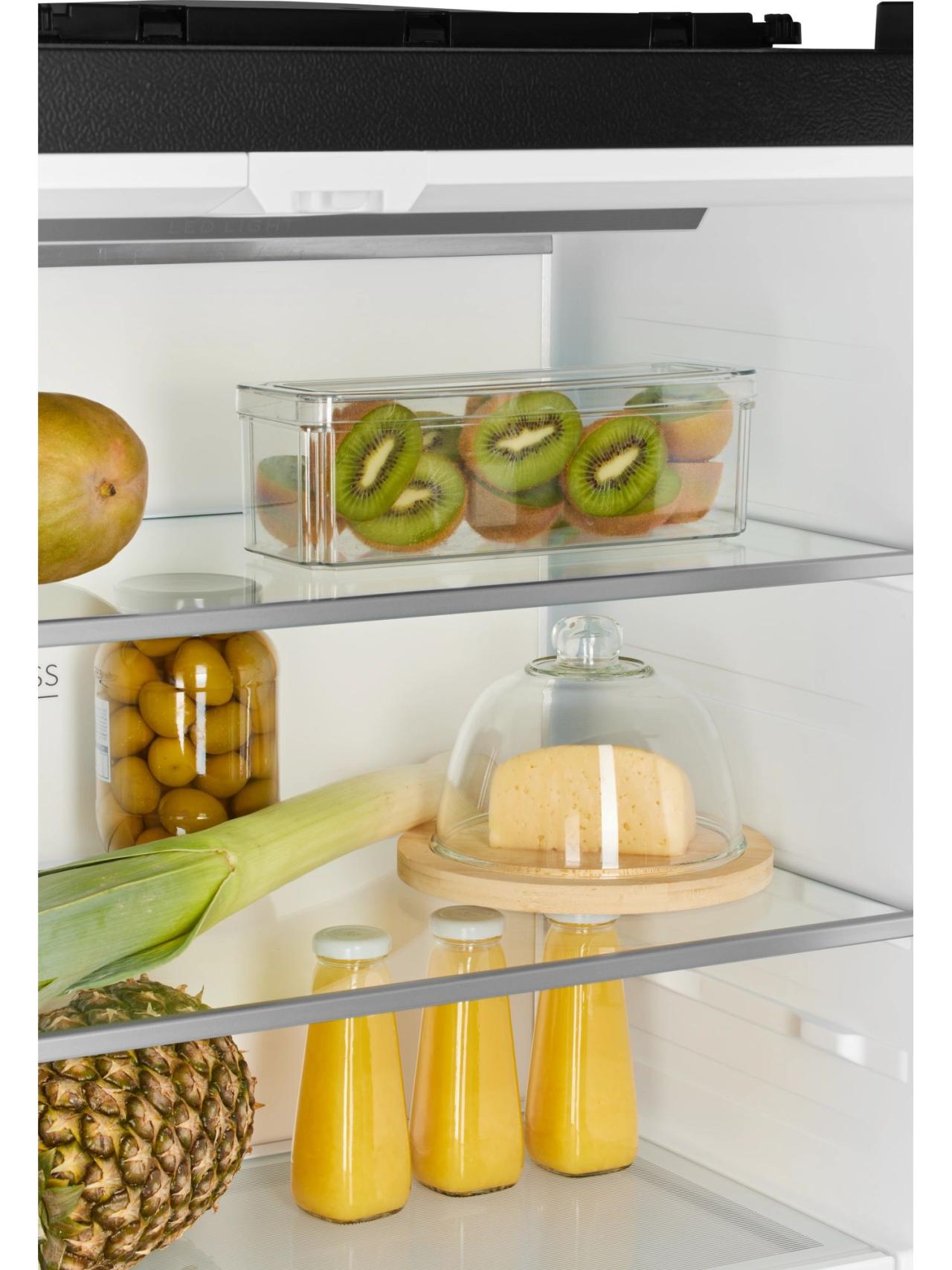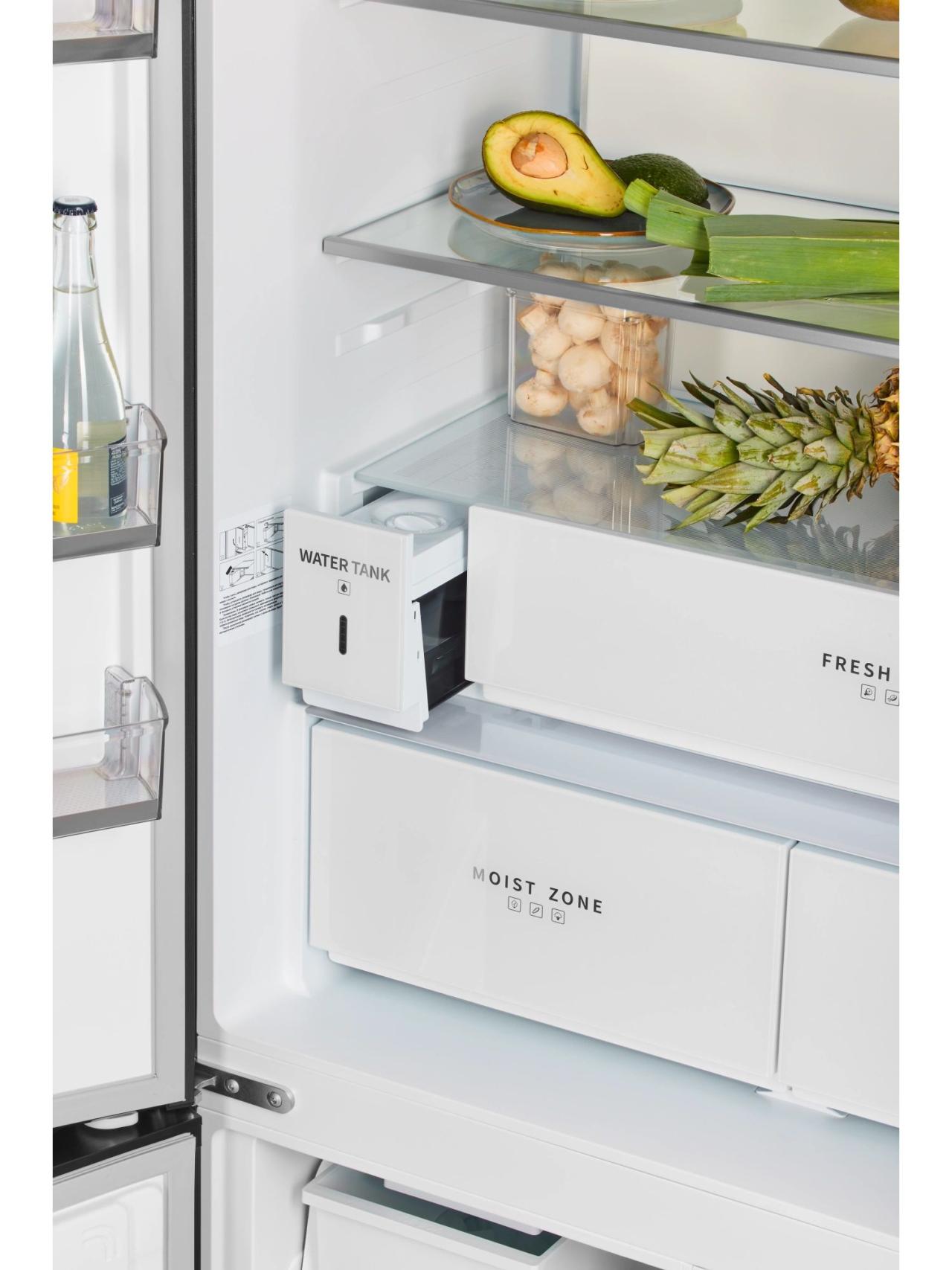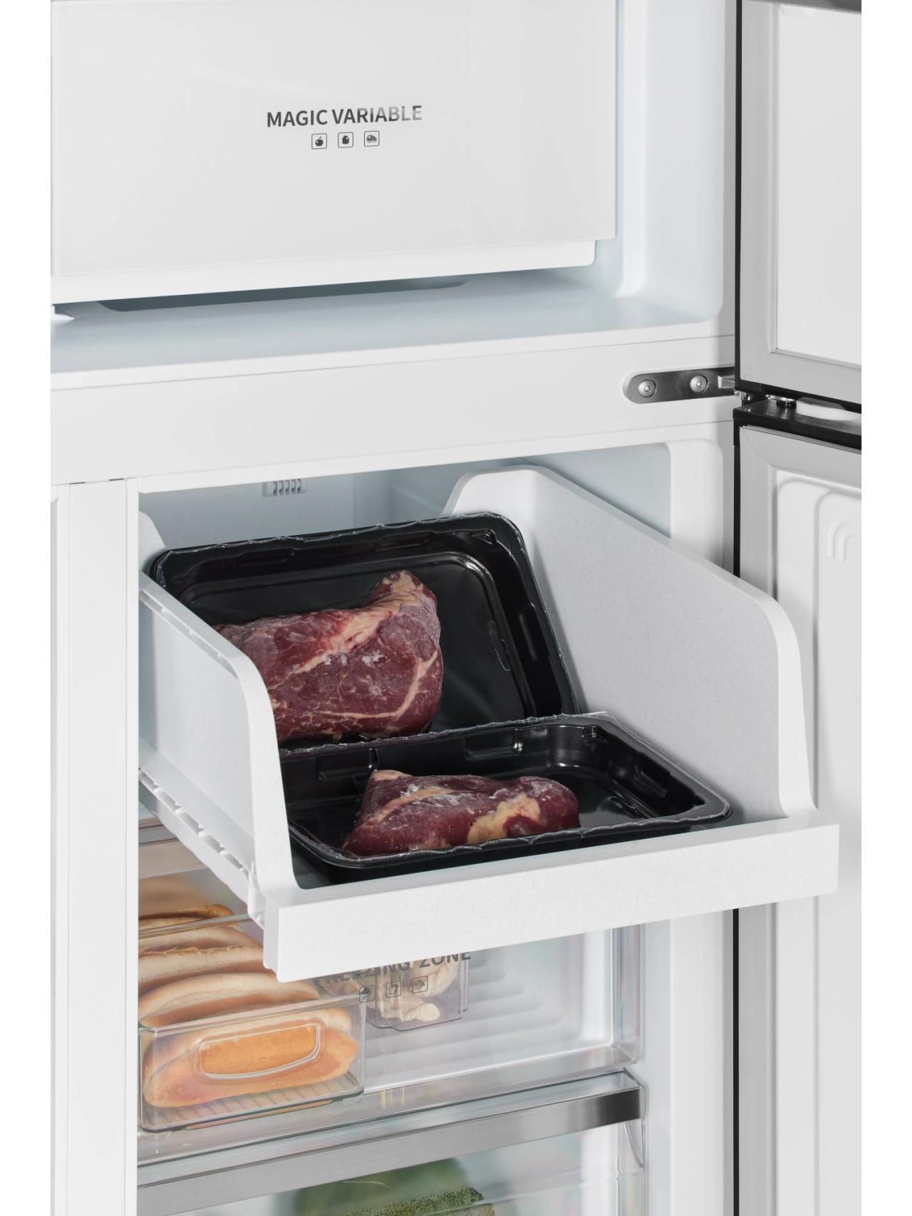 Главное преимущество модели — общий объем 600 л, который позволяет хранить крупные запасы без компромиссов в организации пространства. Двери с открытием на 90° обеспечивают удобный доступ ко всем полкам и ящикам даже при установке рядом с мебелью, а продуманная компоновка помогает быстро находить нужные продукты.