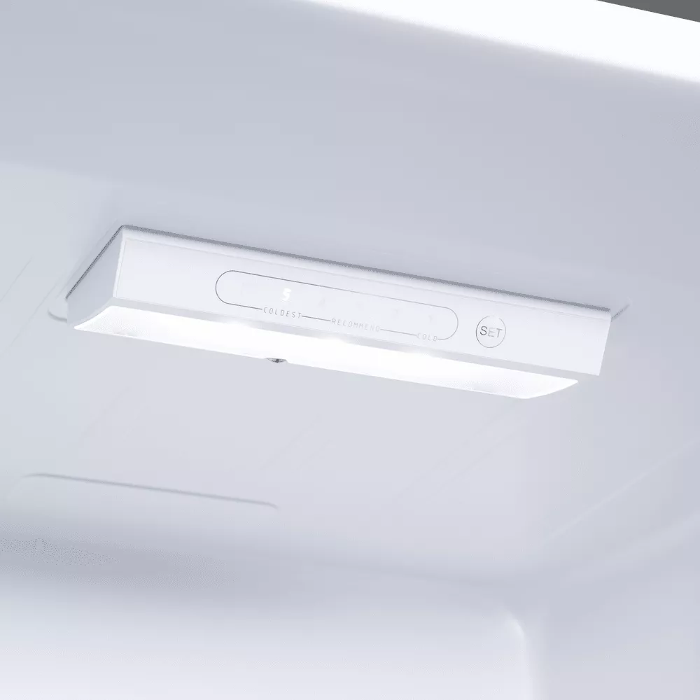 Сенсорное управление на верхнем дисплее позволяет задавать температуру от +2°C до +8°C и активировать быстрое охлаждение морозильной камеры. Система SmartFrost уменьшает образование инея, а полезные функции — сигнализация открытой двери, восстановление режима и задержка включения компрессора после перебоя питания — заботятся о сохранности продуктов.