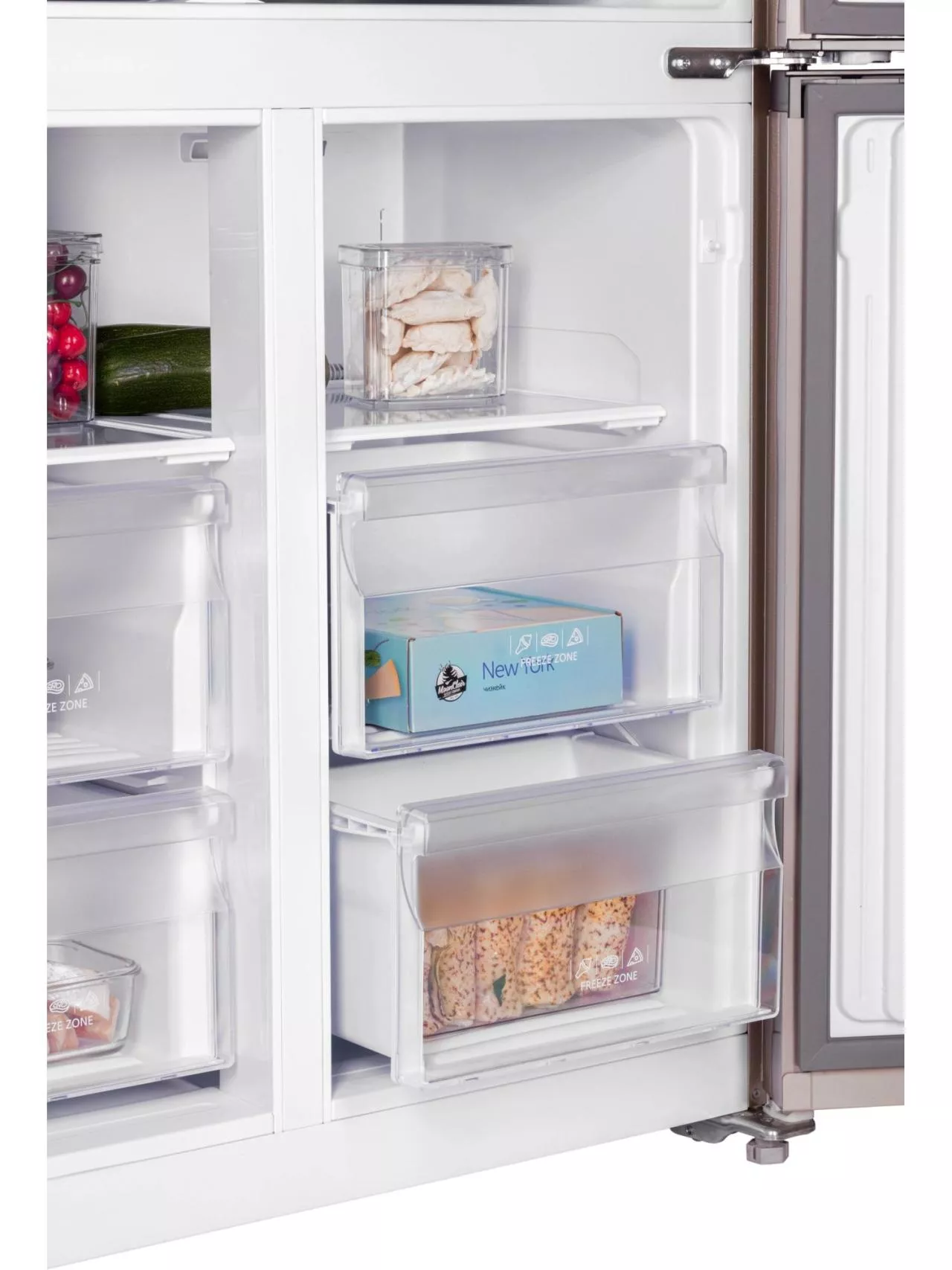 Холодильное отделение с единым пространством удобно для хранения продуктов в габаритной посуде. Расположение стеклянных полок можно отрегулировать под высоту кастрюль и контейнеров. Нижние ящики для овощей и фруктов сохранят их свежесть и привлекательный вид, не утратив полезных свойств. Левый ящик с внутренней мембраной отлично справится с длительным хранением зелени благодаря повышенному уровню влажности.