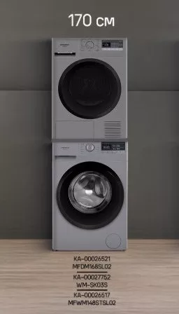 Комплект Maunfeld сочетает стиральную машину MFWM148STSL02, сушильную машину MFDM168SL02 и соединительный элемент WM-SK03S. Решение для полного цикла ухода за бельём и компактного размещения в формате колонны.
