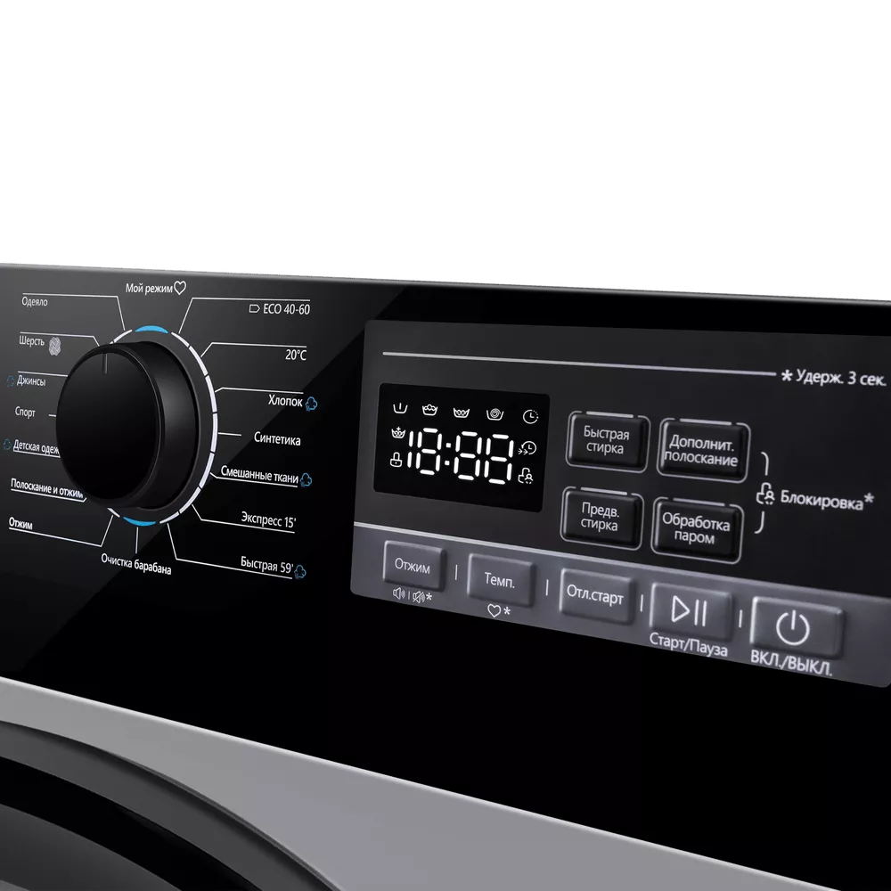 Для освежения вещей и деликатного ухода предусмотрен режим «Обработка паром». Пар глубоко проникает в волокна, помогает разгладить складки, уменьшить запахи и справиться с аллергенами. В наборе программ — «Экспресс 15’», «Шерсть», «Детская одежда», ECO 40-60, «Спорт» и другие решения на каждый день.