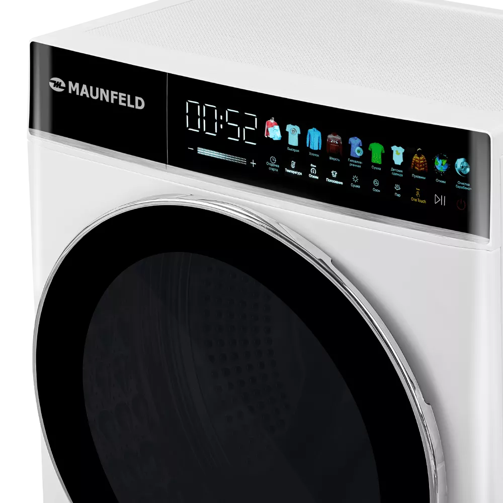 Управление интуитивно понятно: поворотная ручка для выбора программы и сенсорная панель для настроек. Сенсорное управление дополняют полезные функции — от отсрочки старта до блокировки от детей, а также режимы «Пар», «ОЗОН» и One Touch.