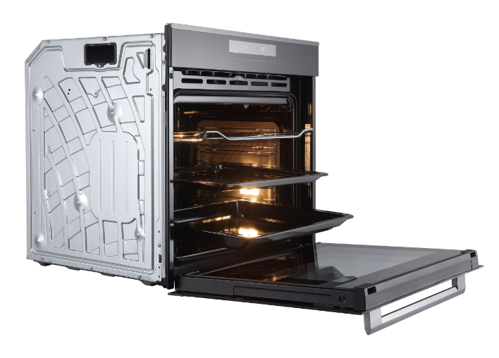 Тройное остекление дверцы удерживает тепло внутри, экономя энергию и делая внешнюю поверхность безопасной для прикосновения. Доводчик дверцы обеспечивает плавное и тихое закрывание. Система