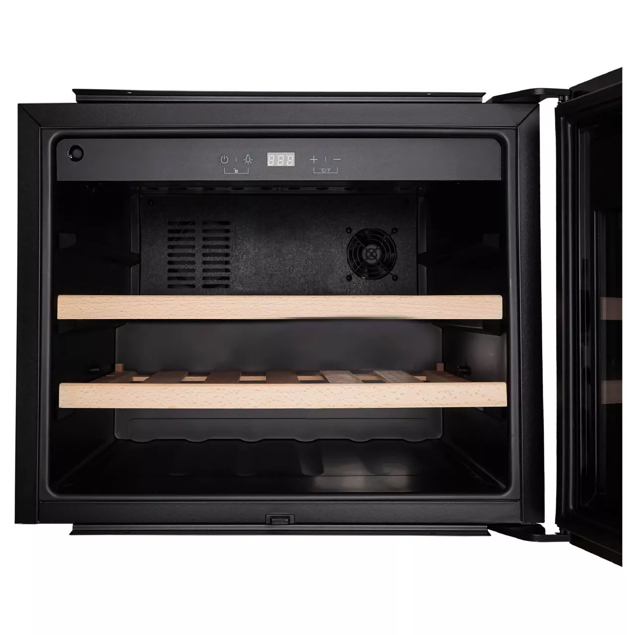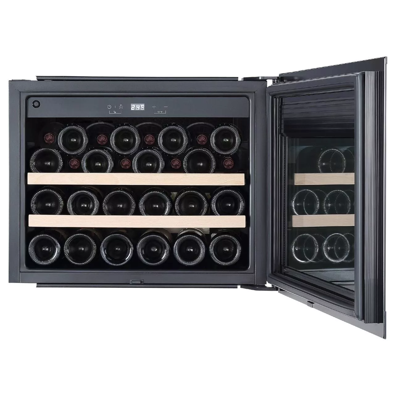 Внутреннее LED-освещение подчеркивает внешний вид бутылок и делает процесс выбора вина удобным и простым. Кроме того, шкаф оснащен функцией сенсорного управления, которое позволяет легко и быстро настроить нужную температуру. Диапазон температур от +5 до +20 градусов Цельсия обеспечивает идеальные условия для хранения различных видов вина. Вместимость шкафа составляет 28 бутылок, что позволяет хранить великолепную коллекцию вин. Две деревянных полок обеспечивают удобное размещение бутылок.