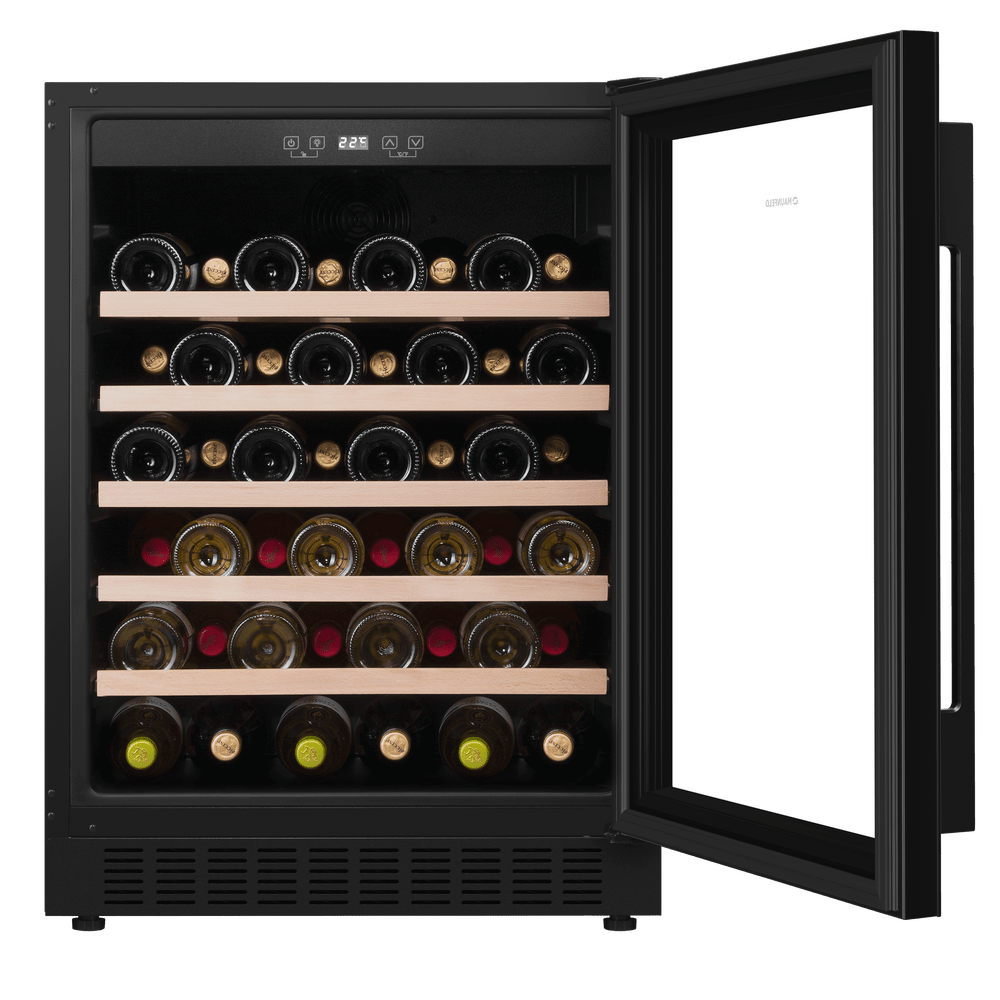 Компрессорная система с вентилятором равномерно распределяет холодный воздух, а дверца из тонированного стекла с УФ-защитой надёжно сохраняет качество вина. Внутренняя LED-подсветка делает коллекцию стильной и заметной.
